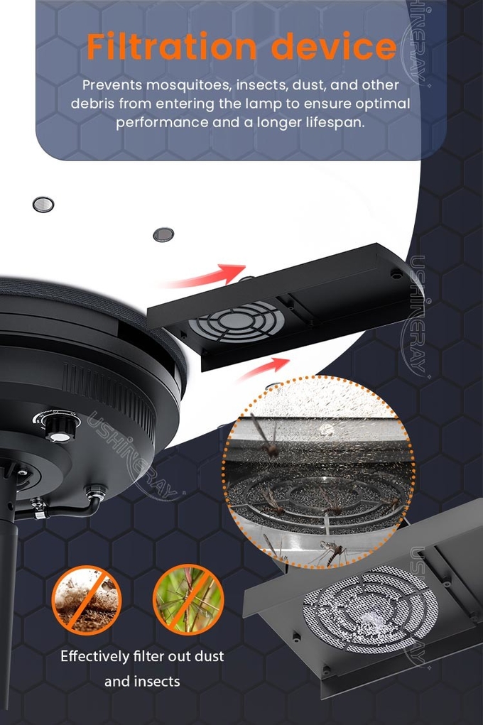 Filter Function: Prevents mosquitoes, dust, and debris, ensuring longer lamp lifespan.