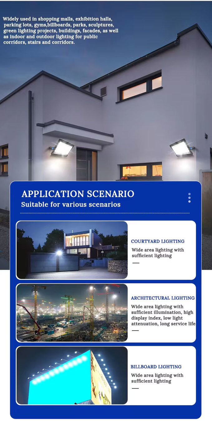 The 500W LED flood light, equipped with smart control, is designed for football fields and stadiums. This advanced floodlight offers customizable lighting options and efficient performance, enhancing visibility for both players and spectators. The 200W flood light provides supplementary illumination, making it a comprehensive lighting solution for large sports venues.